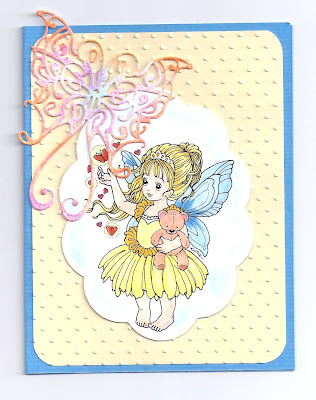 I coloured her with Distress Inks and added some accents with white acrylic paint. The papers I used is from Glitz Design. Here's a close up of the image.